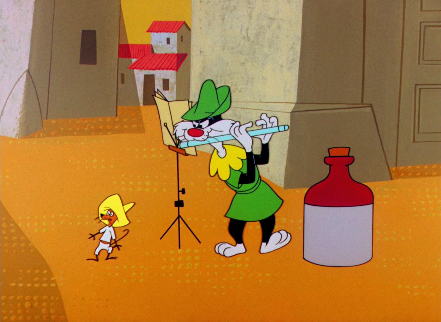 Sylvester finds himself constantly teased by the local mice as they outsmart him at every turn, going so far as to bonk him on the head with a two-by-four when he insults them, no matter how far away he is from their hole. Hoping to get even with them, Sylvester is inspired by a book based on the Pied Piper of Hamelin and goes to take music lessons on the flute. Once he has studied the flute well, he returns to get his payback on the mice. At first, when the mice see him, they ridicule him, but their taunting ends abruptly when Sylvester plays Jarabe Tapatío on his flute. One by one, the tune entrances the mice and makes them dance out to Sylvester, who then conks them on the head with his flute and places them in a large bottle.